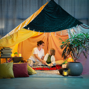 Set up a designated “camp” space where the kids can gather each day. A backyard tent, blanket fort, or even a decked-out garage can do the trick. Look for: