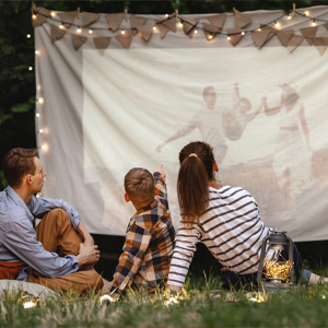 - Snag a DVD projector or portable screen if you’re lucky or make your own with a white sheet and some string.